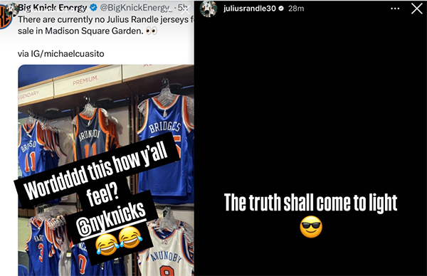24直播网讯 北京时间9月7日, 尼克斯自媒体Big Knick Energy晒照,并发推表示麦迪逊花园球馆球迷商店现在没有兰德尔的球衣;对此,兰德尔本人转发报道,并且配文写道:尼克斯,告诉我你的感受?真相终将大白。