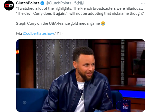 今年巴黎奥运会期间,法国解说员称库里为魔鬼,谈及这个话题,库里本人表示:我看了很多集锦片段,法国解说员太搞笑了。“魔鬼库里又来啦!”不过我自己是不会用这个绰号的。
