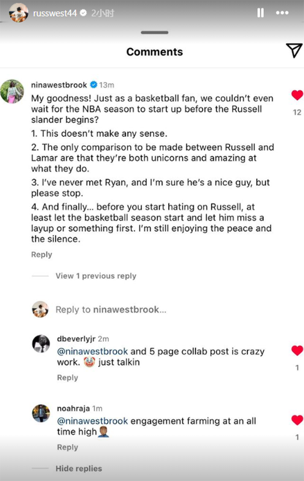 对于这突然的嘲讽,威少本人转发爱妻的言论,具体内容如下——