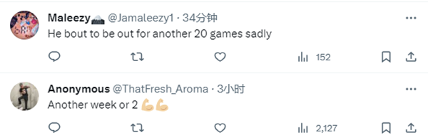 美球迷吐槽比尔的训练——“他将再缺席20场比赛”“再缺席1-2周”“他应该接受治疗而不是试训训练”“他的背看起来太僵硬了”。