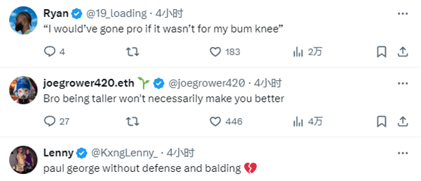 特雷-杨的言论引争议,美球迷调侃:如果不是膝盖受伤,我早就成为职业球员了;还有球迷表示:兄弟,身高越高并不一定意味着你就越优秀;更有球迷吐槽:(2米03)保罗-乔治没有防守,秃子。
