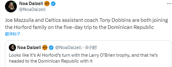 据凯尔特人记者Noa Dalzell报道,绿军主帅马祖拉和助教托尼-多宾斯将和霍福德一家在多米尼加进行为期5天的旅行。
