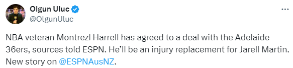 哈雷尔现年30岁,去年休赛期与76人续约,无奈续约后再8月份遭遇前十字韧带的伤病,10月份被裁掉后一直失业,今夏也未能从NBA获得新合同;如今正值当打之年的哈雷尔决定前往NBL联赛打球,为阿德莱德36人效力。