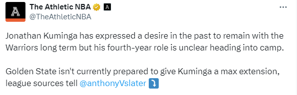 Anthony Slater报道,明年夏天库明加与穆均将成为受限制自由球员,两人的提前续约合同谈判到目前为止还没有显著进展。消息源透露,勇士还没有准备好与库明加提前续签顶薪(5年2.24亿美元)(也没准备好为库明加提供接近顶薪的合同。