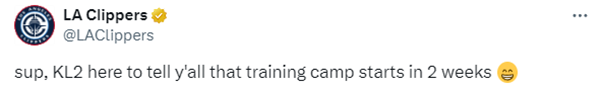 24直播网讯 北京时间9月18日,快船官方通过社媒晒出一张小卡咧嘴大笑的训练照,配文写道:科怀-莱昂纳德在这里告诉你们,离快船训练营开始仅剩两周了!