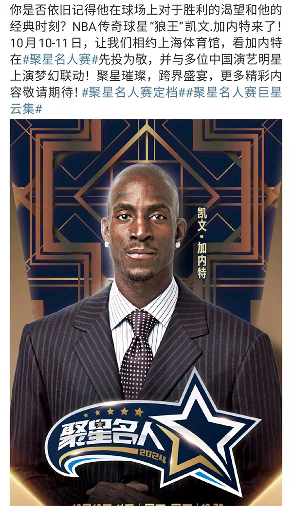 加内特上任了什么新岗位呢?为了更好的推动中国篮球发展,为了提升篮球影响力,让更多的人一起投入到中国篮球的发展当中,CBA名宿马布里发动了2024年“聚星名人赛”,这场比赛,马布里牵线邀请了包括加内特在内的NBA退役名宿,同时邀请了宋雨琦、李宇春等等演艺圈的明星参赛,马布里计划将篮球+明星+公益等元素融合,更好的帮助中国篮球推广。