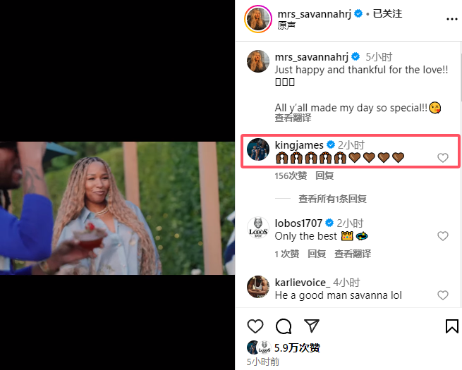 詹姆斯为爱妻点赞并且在评论区晒表情秀恩爱。