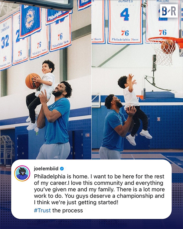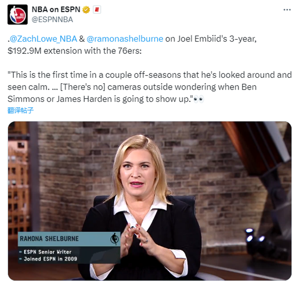名记拉蒙娜-谢尔本在节目中解释恩比德为何同意现在续约:因为这是恩比德多年来第一个能感受到平静的休赛期,他环顾四周,看到的是马克西、是保罗-乔治、是埃里克-戈登、是凯莱布-马丁,他不用再担心哈登或者本西会不会来打比赛、不用再担心(本西)会不会打着打着就从兜里掏一个手机出来……