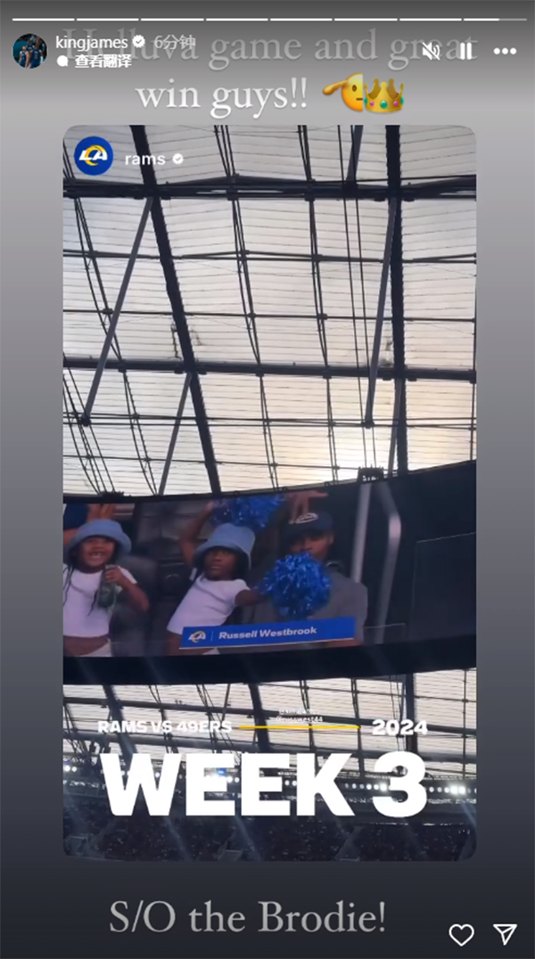 威少带着孩子也来观看49人与公羊队的比赛,也在大屏幕中挥手致意;赛后,詹姆斯转发公羊队的致敬视频,配文写道:精彩的比赛,漂亮的胜利,伙计们。