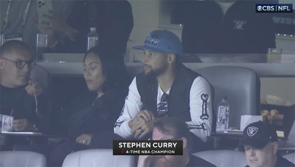 另外勇士球星库里与妻子阿耶莎来到现场观看NFL卡罗来纳黑豹VS拉斯维加斯突袭者队的比赛,镜头给到库里时,现场介绍为:4届NBA总冠军!