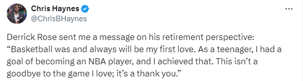 据名记Chris Haynes报道,谈到退役,罗斯表示:“篮球曾经是、也永远是我的最爱。十几岁的时候,我就立志要成为一名 NBA 球员,现在我实现了这个目标。这不是对我热爱的这项运动的告别,而是一种感谢。