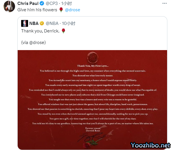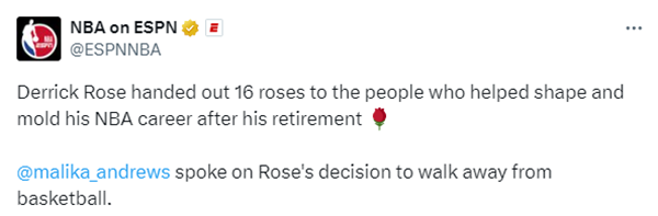 据ESPN名记Malika Andrews报道,德里克-罗斯向生涯贵人赠送了16束玫瑰花;Andrews透露:罗斯想确保把玫瑰赠与那些真正帮助他塑造自己与职业生涯的人,他实际上邮寄了16束玫瑰花,给禅师、他的四名好友,以及帮助他度过了人生起起落落的训练师们。