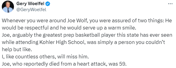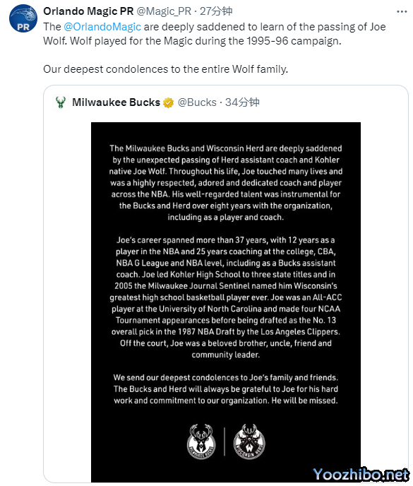 雄鹿官方声明:雄鹿队对乔-沃尔夫的意外离世深感悲痛,在他的一生中,乔感动了许多人,他是一位备受尊敬、崇拜和敬业的NBA教练和球员。在过去的八年中,无论是作为球员还是教练,他的天赋都为雄鹿队发挥了重要作用。
