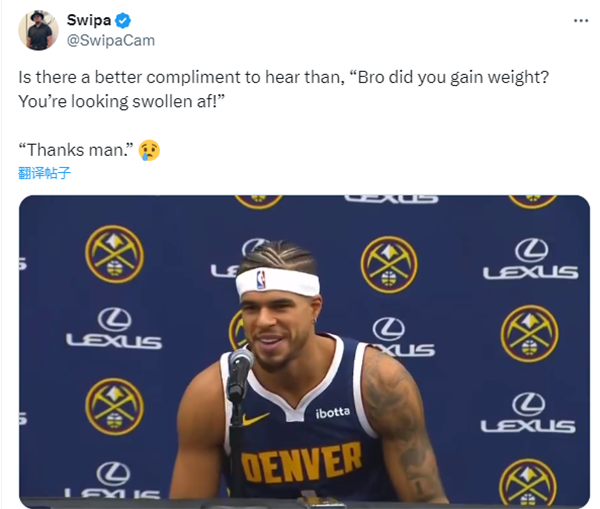 接受采访时,一位记者提问:兄弟,你增重了吗?你看起肿得厉害。对此,小波特笑着回应:谢谢你啊兄弟。