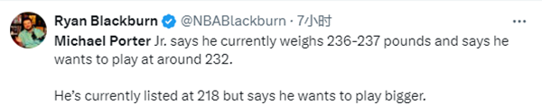 据小波特本人透露,目前他的体重为236磅-237磅(214斤),他希望在新赛季开打前减到232磅(210斤);目前掘金官网上,小波特的体重还是上赛季的198斤,换言之,今年休赛期,小波特增重了18斤。