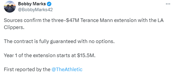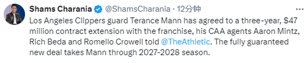 曼恩与快船队的合同还剩下1年,24-25赛季的年薪约为1142万美元;NBA薪资专家Bobby Marks进一步报道,这是一份全额保障合同,没有任何选项,将持续到2027-28赛季,新合同起薪是1550万美元。
