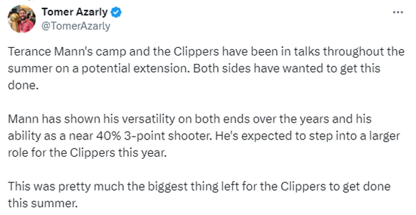 快船记者Tomer Azaly报道,曼恩的团队与快船队整个夏天都在就续约问题进行谈判。双方都希望能够达成协议。 多年来,曼恩已经展现出他在攻防两端的全面性,以及打出接近40% 的三分命中率。预计他今年将在快船队中扮演更重要的角色。