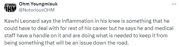 当被问及膝盖炎症是否会成为自己未来职业生涯中不得不一直面对的问题,小卡表示:事情可能会变成那样,但我们知道该如何做,我们可以做一些事情来延长我整个赛季的比赛时间。我们会解决的,我很高兴我现在感觉很好,感觉比以前好多了。