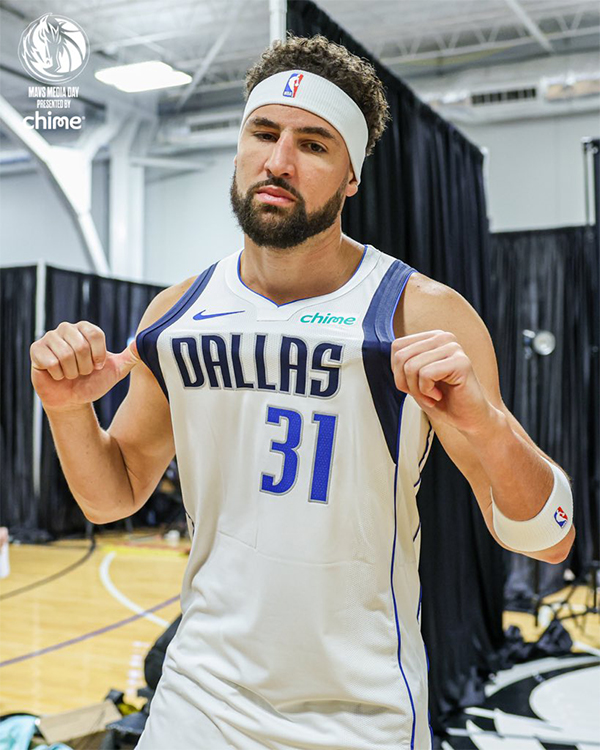 克莱-汤普森身穿独行侠31号球衣参加媒体日,戴着白色发带拍摄定妆照。