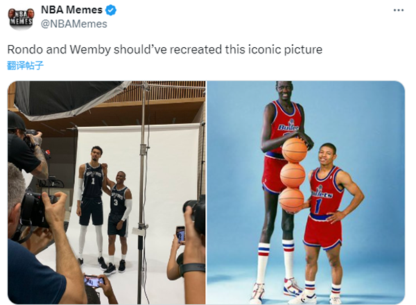 文班和保罗两人身高相差41厘米,如此身高差的合影像极了当年2米31波尔与1米60博格斯的经典合影。