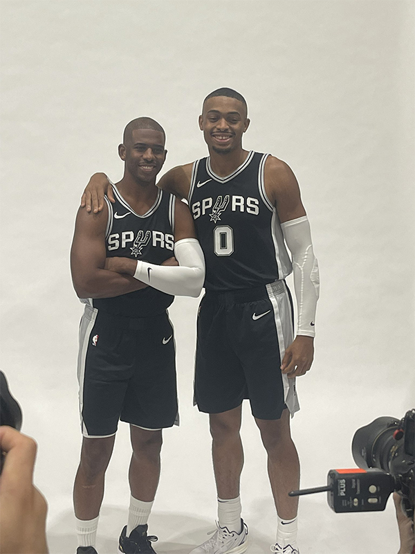 保罗还与凯尔登-约翰逊、卡斯尔等人合影,其中约翰逊把3号给保罗,自己则是改穿马刺0号球衣。