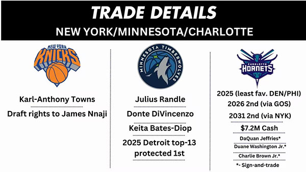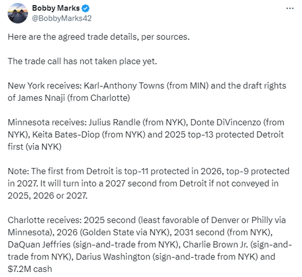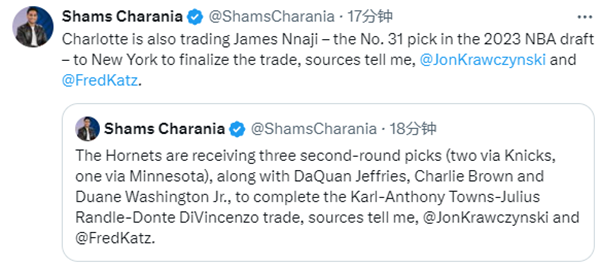 尼克斯得到:唐斯(来自森林狼)、2023年31号秀詹姆斯-纳吉的签约权(来自黄蜂);