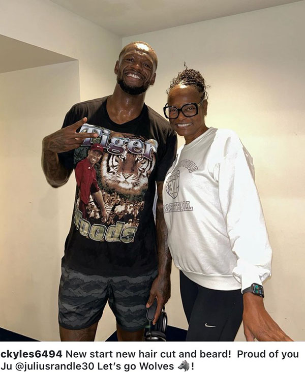兰德尔的妈妈晒母子合影并表示:新发型和新胡子,重新开始!为你感到骄傲,森林狼,我们加油!