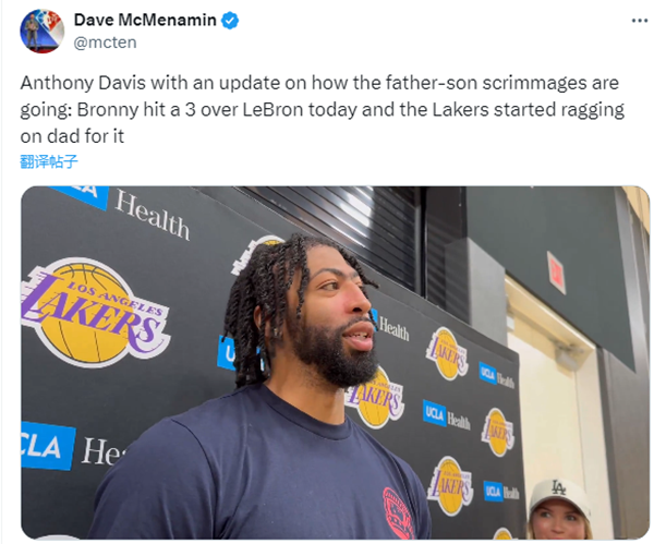 训练后浓眉透露詹姆斯父子之间的对位,浓眉表示:这很棒,能够回归训练,布朗尼面对他爸投进了一记三分。大家都很高兴,拍打布朗尼。詹姆斯回头就一个野牛冲撞,忘记是对谁了,冲到篮下上进。然后布朗尼又投进一个三分,里夫斯带球过来,詹姆斯疯狂要球。所以你能看到他们想要竞争,大家都喜欢看到这一点;你能看得出来,就算他们没有直接对位,其中的竞争意识还是很强烈的。这是我们很爱看到的,考虑到父子同队这种历史性的纪录。我很荣幸能够在这里见证历史。