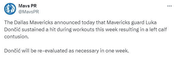 东契奇因小腿挫伤至少休养一周,NBA生涯至今,东契奇的左小腿已经多次手术,2022年因小腿拉伤缺席了13天,2023年因小腿拉伤缺席了16天,如今遭遇小腿挫伤。