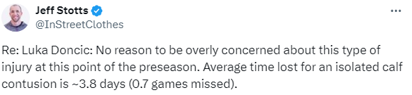 不过东契奇的伤势应该无大碍,医学专家Jeff Stotts表示,在季前赛的这个阶段,没有必要过度担心这种伤病,小腿挫伤的平均缺席时间约为3.8天(缺席0.7场比赛)。