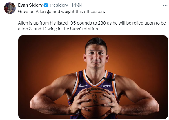 新赛季,冠军教头布登霍尔泽将执教太阳,预计杜兰特、布克、比尔、努尔基奇和泰厄斯-琼斯担任首发五虎,阿伦将在替补阵容中发挥作用,对此阿伦并不在乎,他只想帮助太阳赢球。