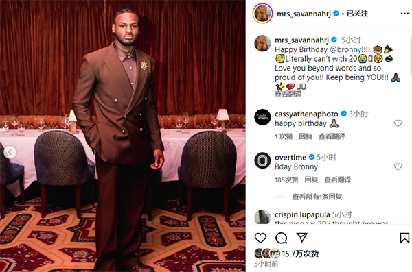 布朗尼的妈妈和奶奶也祝福他,萨瓦娜晒照并写道:祝你生日快乐,布朗尼。你已经20岁了,我简直无法相信。爱你无以言表,为你感到骄傲!!继续做你自己。
