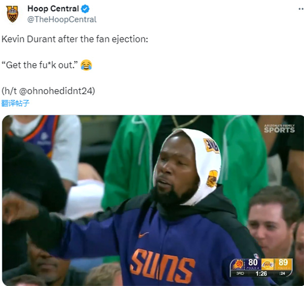 球迷拒绝换球引发冲突并且导致比赛延迟一大会,詹姆斯等人都示意把该球迷赶出去,其中杜兰特的反应最直接,杜小帅顶着湖人队白色毛巾,挥手并且爆粗直言:滚出去。