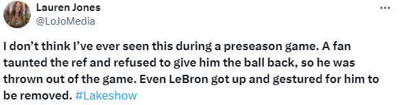 美记者Lauren Jones晒现场视频,并且发推写道:我从未在季前赛中见过这种情况,一名球迷试图在篮框后面投篮,戏弄裁判,拒绝将球还给他,因此他被赶出了比赛。