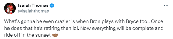 前NBA球员、湖人旧将小托马斯更是发推写道:他要是也能和布莱斯打球就更疯狂了。一旦他做到了,他就能退役了,哈哈。现在一切都将完成,然后在夕阳中驰骋。