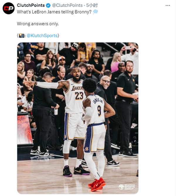 在球场上,詹姆斯伸手指向远方并且冲着布朗尼训话,一脸凶相貌似很生气;美媒ClutchPoints转发这张合影并配文写道:猜猜詹姆斯在场上对布朗尼说了什么?