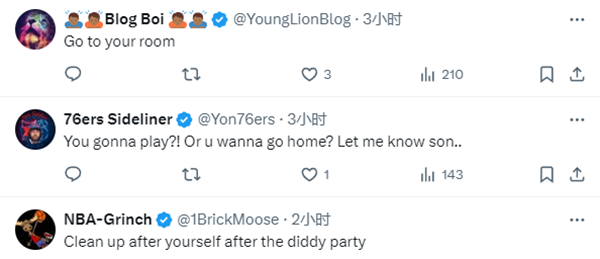 美球迷调侃老詹对儿子说的话:“滚回你的房间吧”“你想留在场上还是回家?儿子,让我知道”“派对之后你自己收拾”。