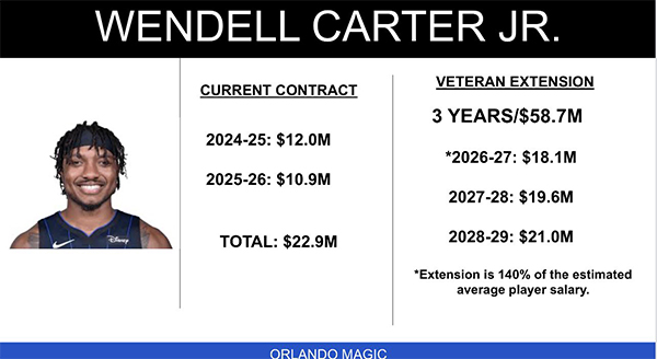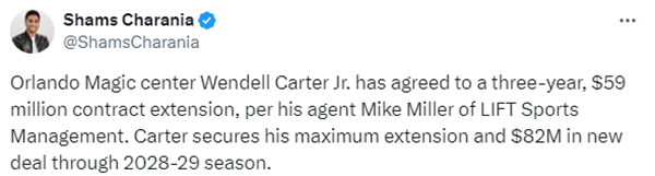 卡特获得了最高续约金额,续签新合同后,他与魔术未来5年的合同总价值达到8200万美元,合同将延续到2028-29赛季。