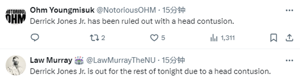 上半场快船遭遇新的伤病,小德里克-琼斯意外受伤,趴在地板上十分痛苦,初步诊断,琼斯的头部挫伤,并且因伤退出比赛。伤退前,琼斯上场13分钟,1投1中拿到3分3盖帽1抢断。