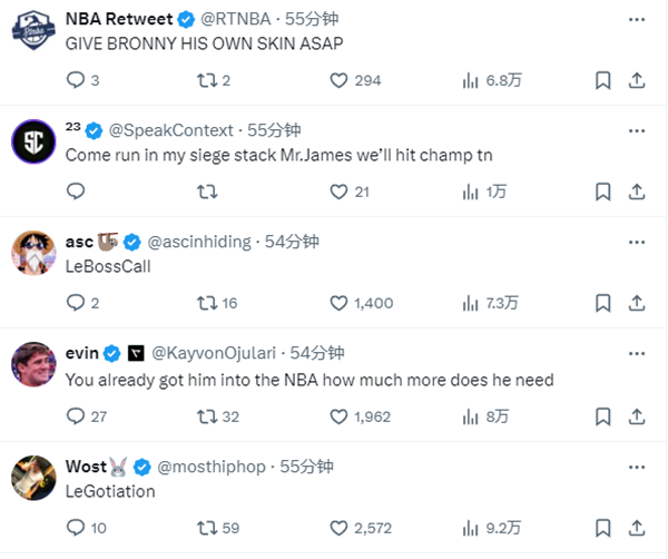 詹姆斯为布朗尼要皮肤引热议,美媒在评论区表示:赶紧给布朗尼搞一套皮肤;球迷纷纷调侃詹老板打电话了;还有球迷表示:你已经让他进入NBA了,他还需要多少。