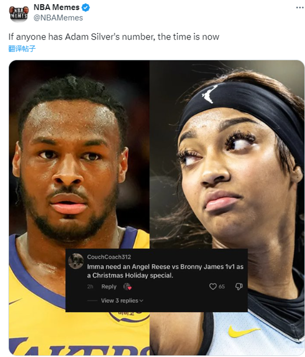 美媒NBA Memes发推调侃布朗尼近期在NBA的表现,称应该立马打电话给亚当-肖华,让其安排布朗尼-詹姆斯和WNBA球星安吉尔-里斯来一场圣诞节单挑赛。