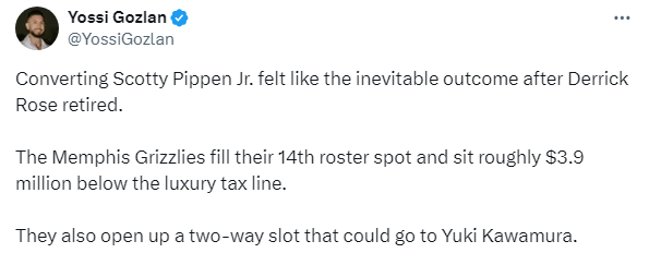 NBA薪资专家表示,罗斯退役后,皮蓬获得保障合同是不可避免的,现在灰熊队有14名正式合同球员,薪资低于奢侈税390万美元,他们可以给河村勇辉一份双向合同。