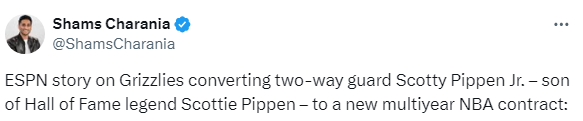 据名记shams报道,灰熊将和小斯科特-皮蓬签下一份多年合同,皮蓬在2023-24赛季取得了令人印象深刻的成绩,并在NBA夏季联赛和季前赛中表现出色,现在他获得了一份有保障的新合同。