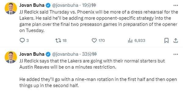 对阵勇士赛前,湖人主教练雷迪克表示:里夫斯今天可以出战,但有时间限制。本场比赛将派出常规首发阵容,并在上半场进行常规的9人轮换,模拟常规赛的阵容轮换,下半场再放开时间给角色球员。