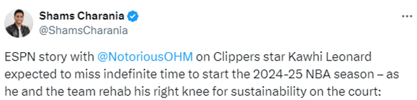 来源:24直播网10-18 09:2524直播网讯北京时间10月18日,ESPN名记Shams报道,快船球星莱昂纳德预计在NBA新赛季初期无限期缺阵,因为他要进行右膝炎症康复治疗,33岁的莱昂纳德没有参加快船整个季前赛,也没有参加训练营期间任何涉及场上接触的活动。