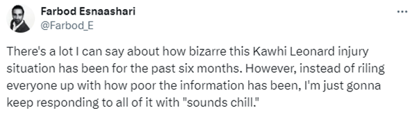 快船记者Farbod Esnaashari表示,关于过去六个月科怀-莱昂纳德受伤的怪异情况,我可以说很多。但是,我不会用糟糕的信息激怒大家;快船另一队记Joey Linn则收集了有关小卡膝盖炎症的消息,并整理成了时间线。