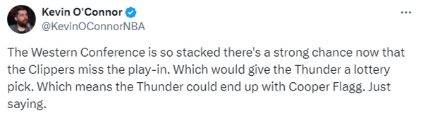 NBA记者凯文-奥康纳表示西部联盟实力雄厚,快船可能连附加赛都进不了,这样雷霆就有机会获得乐透选秀权,这意味着雷霆可能得到库珀-弗莱格。