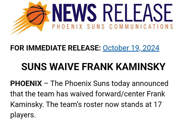 太阳裁掉卡明斯基后公布新赛季17人名单——