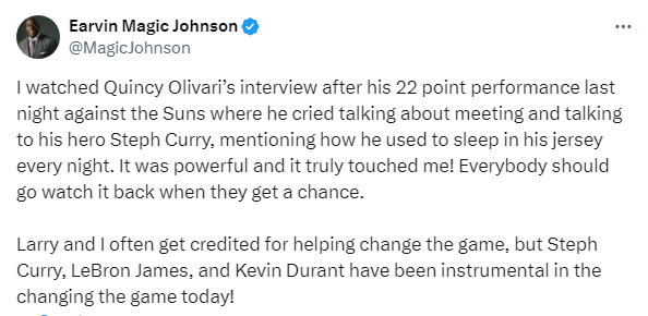 魔术师还发推写道:我看了昆西-奥利瓦里昨晚对阵太阳队时拿下22分后的采访,他在采访中哭着谈到与他的偶像库里见面以及交谈,提到他过去每天晚上都穿着球衣睡觉。这很有力量,真的让我很感动!每个人都应该再去看一看他的表现。