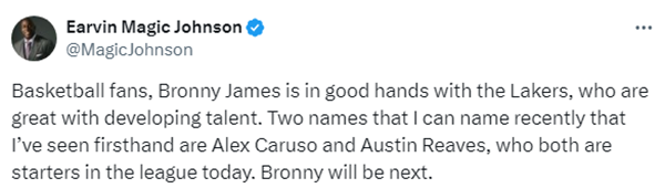 魔术师还表示:球迷们,布朗尼-詹姆斯在湖人队中表现不错,湖人队非常善于培养人才。最近我亲眼见过的两个人是亚历克斯-卡鲁索和奥斯汀-里夫斯,他们都是当今联盟的首发球员,下一个将是布朗尼。